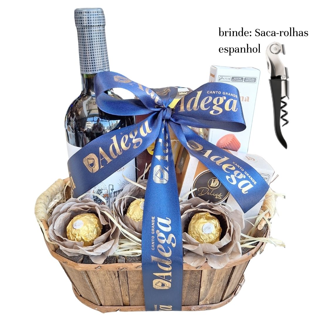 Vinho Chileno tinto, bombons de brigadeiro, bombons Ferrero Rocher, grissinis e castanhas temperadas.