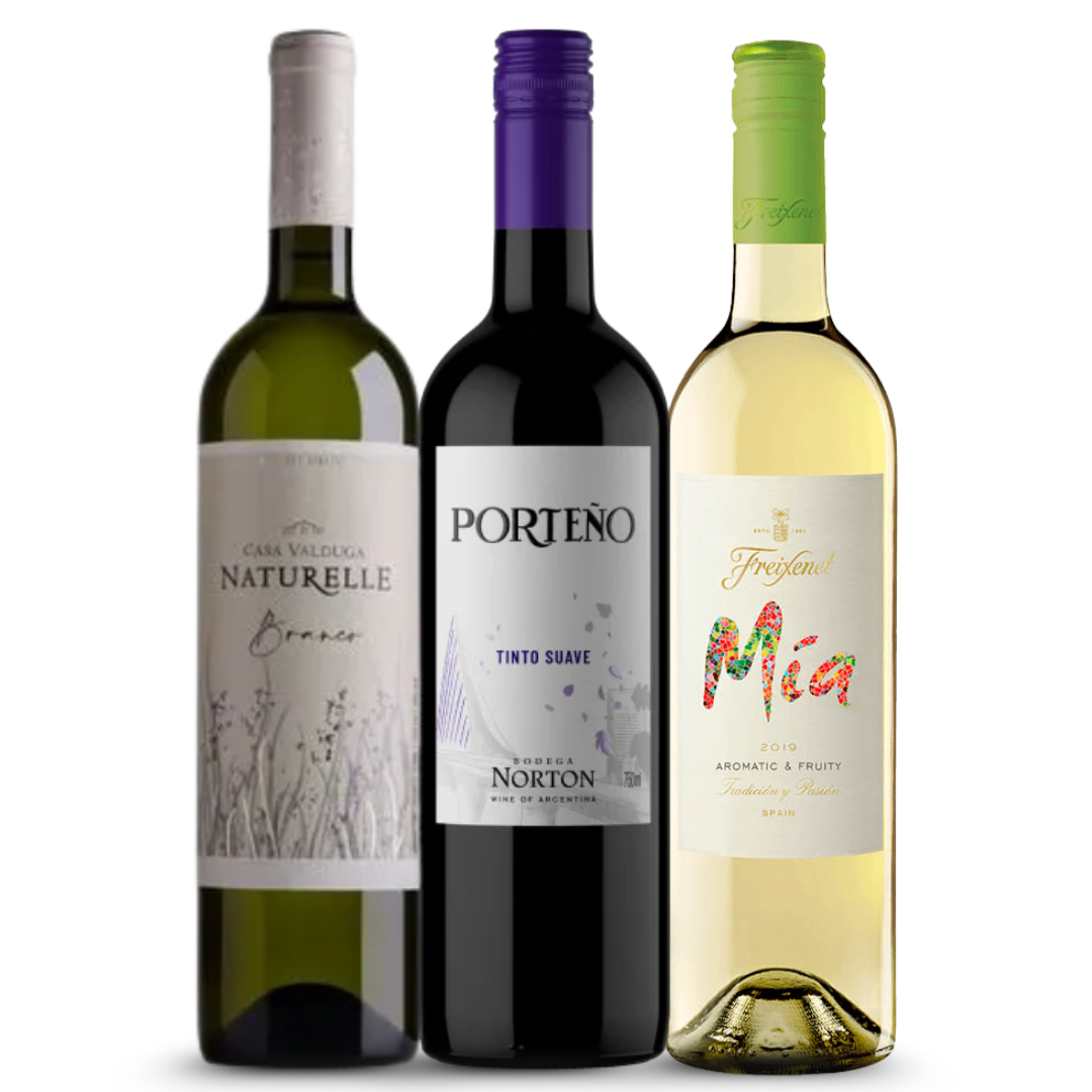 Visão: Vinho Casa Valduga Naturelle Branco Suave 750ml Vinho Branco Espanhol Mia Demi-Sec 750 ml Vinho Tinto Argentino Porteno Suave 750 ml Kit Contendo 01 Unidade de cada vinho.